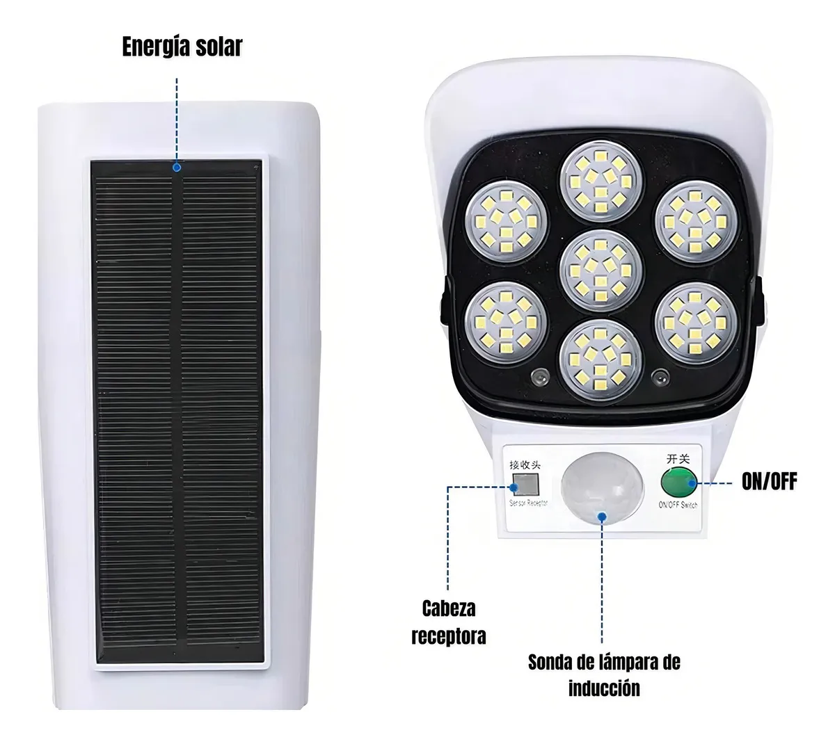 3 modos de iluminación: - Luz apagada por la noche, solo luz roja intermitente, modo de luz fuerte encendido cuando se detecta movimiento. -Modo de luz débil por la noche, modo de luz fuerte encendido cuando se detecta movimiento. -Modo siempre encendido, la luz roja siempre parpadea en cualquier modo.